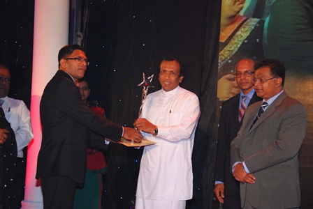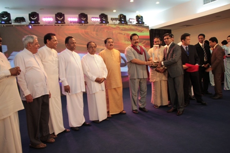 President Mahinda Rajapaksa presenting the Outstanding Entrepreneur Award at the Rupavahini Viyaparika Kirula awards presentation